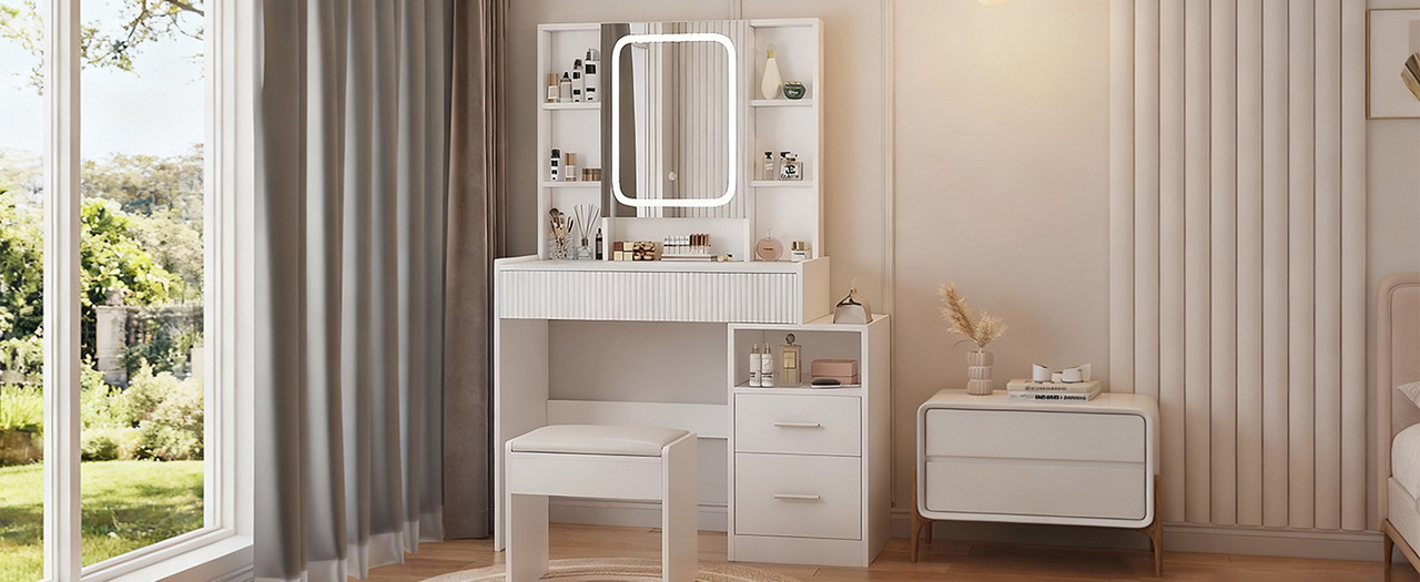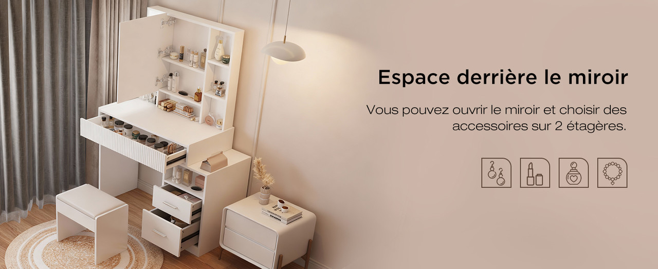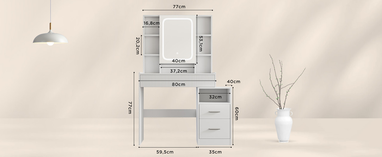 Cette coiffeuse offre un rangement complet avec une tablette supérieure, 7 compartiments ouverts, 1 grand tiroir, un miroir LED extra-large ainsi qu’une armoire avec 2 tiroirs et compartiments ouverts. Idéal pour organiser maquillage, bijoux et accessoires du quotidien.