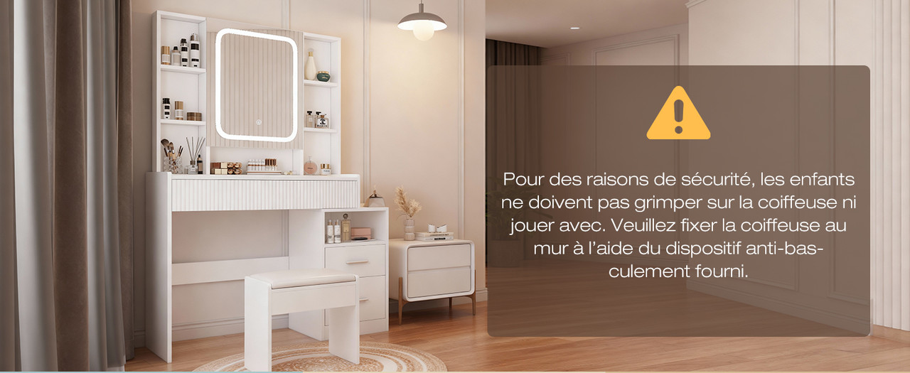 Fixez la coiffeuse au mur à l’aide du dispositif anti-basculement fourni pour garantir une utilisation sécurisée.