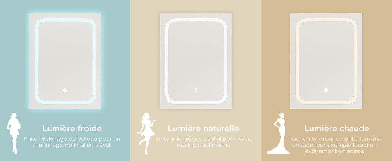 Ajustez la luminosité en maintenant le bouton enfoncé et changez la couleur de la lumière par une simple pression. Créez l’ambiance parfaite pour votre maquillage.